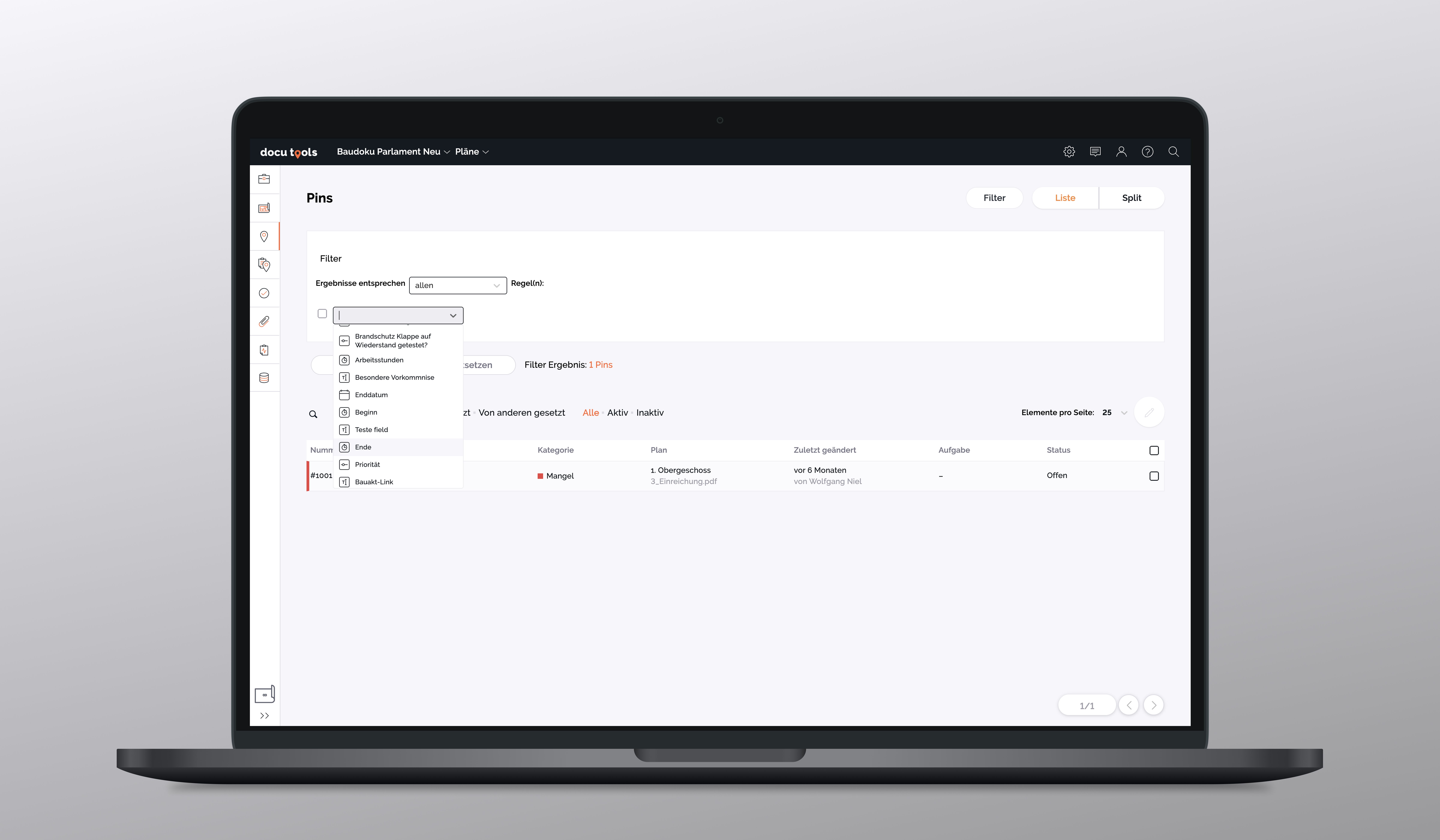 Die komplexen Filter im Pin-Menü der Web-App wurden erweitert: Ab sofort können Benutzer:innen gezielt nach den Werten benutzerdefinierter Pin-Felder filtern. Diese Felder werden mit einem vorangestellten Symbol versehen, das den jeweiligen Daten- oder Eingabetyp (z. B. Text, Zahl, Datum) kennzeichnet. Das Filtern ermöglicht eine präzisere und schnellere Berichterstellung und einen besseren Überblick über den Projektstatus. Standardmäßig werden nur aktive Felder angezeigt, optional lassen sich auch inaktive Felder einbeziehen. Dieses oft gewünschte Feature ergänzt die Pin-Felder um eine entscheidende Analysefunktion und macht sie noch vielseitiger im täglichen Einsatz.