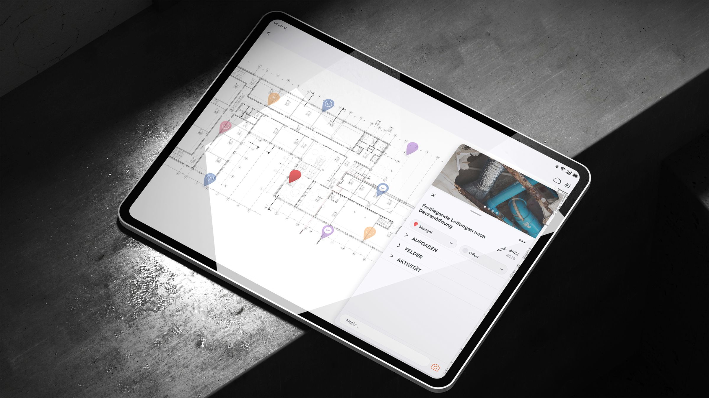 Das Herzstück der App ist der neue Offline-Sync: Projekte werden im Hintergrund synchronisiert, ohne die Arbeit auf der Baustelle zu unterbrechen. So können Aufgaben, Pins, Fotos und Notizen jederzeit erfasst werden – auch ohne Internetverbindung.