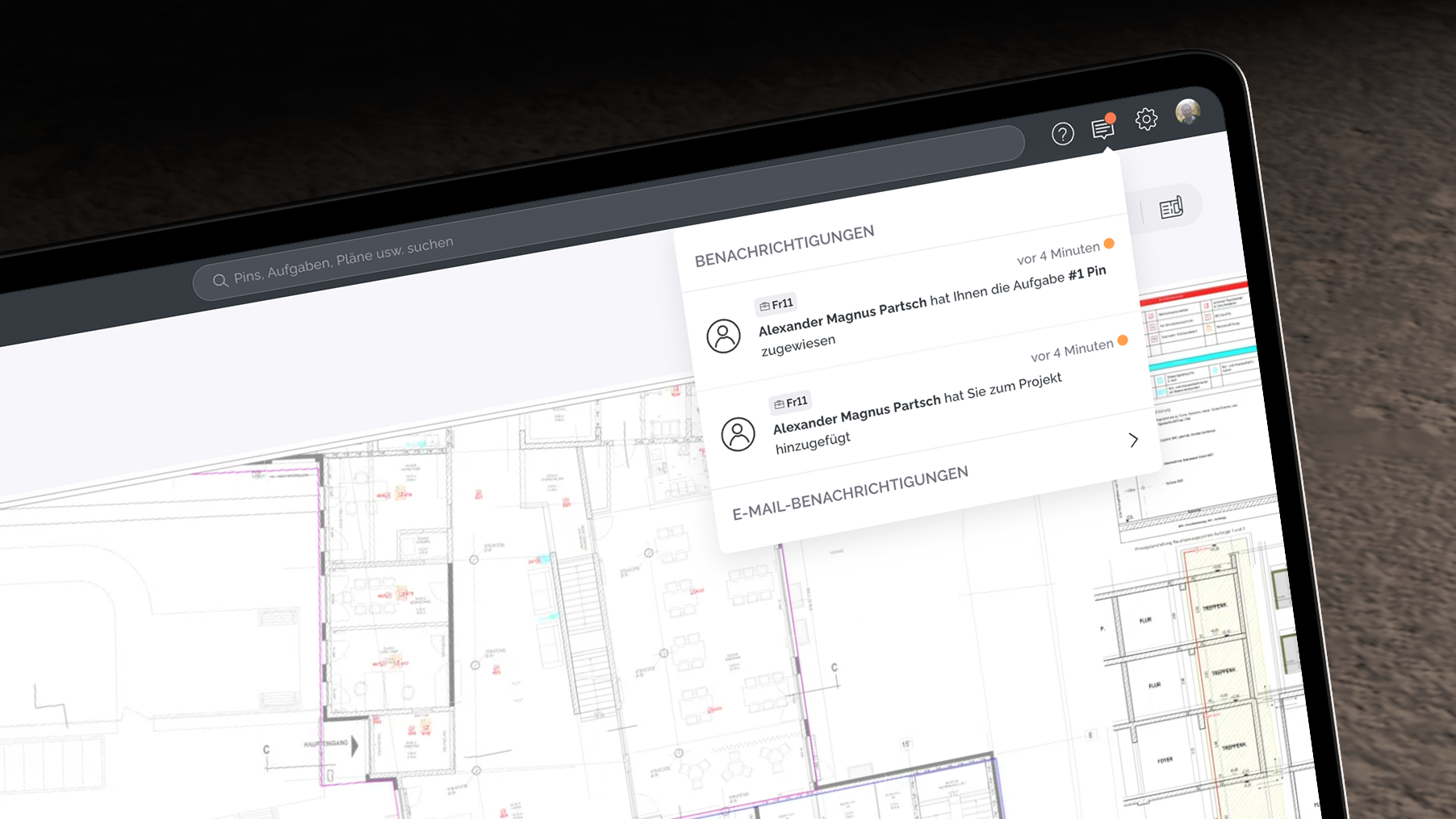 Auch die Suche wurde erweitert: Sie ermöglicht das schnelle Auffinden von Pins, Aufgaben und Plänen auf Projektebene und liefert zusätzlich relevante Metadaten für eine bessere Einordnung. Gleichzeitig dient sie als dynamischer Verlauf und zeigt zuletzt aktualisierte Inhalte an – für einen noch schnelleren Wiedereinstieg in die Arbeit.